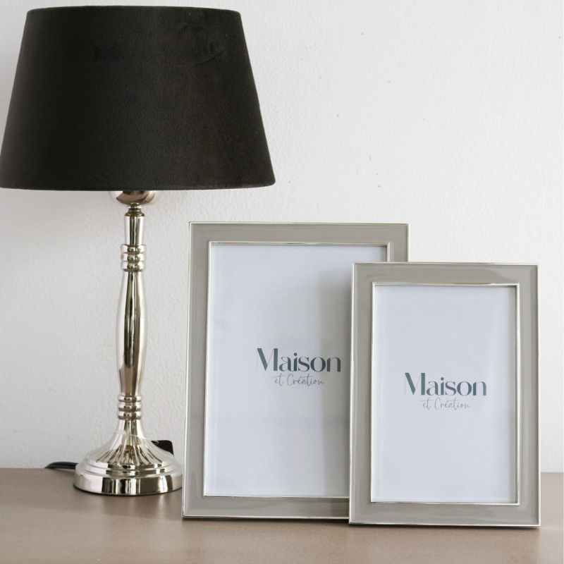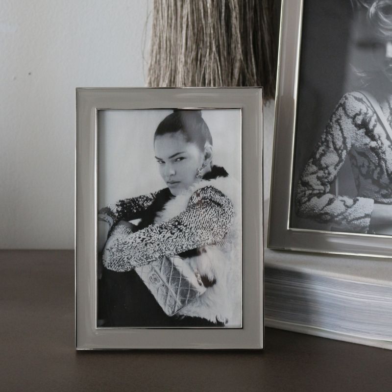 エナメルグレージュの枠にシルバーの縁取りがシンプルで上品なフォトフレーム。大・小2サイズで縦向き・横向き両方置けます。シンプルなので色々なフォトフレームと組み合わせて飾っていただけます。
