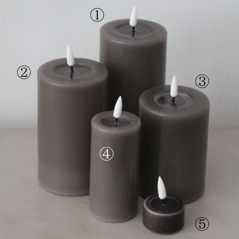 新しいLEDキャンドルは炎の部分がふわふわと優しく灯り、ろうそくの溶けた部分がリアルで本物の様な雰囲気の佇まいです。こちらのモカはシックなカラーとなります。