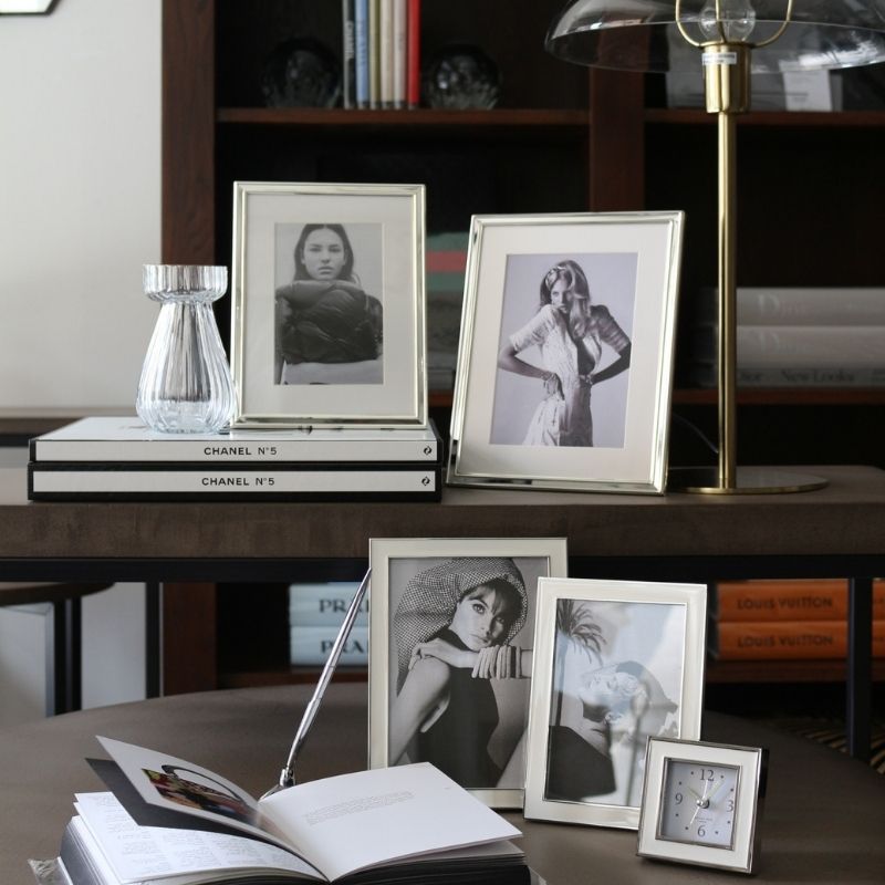 シンプルなシルバーフレームのフォトフレームはスタイリッシュで上品な印象です。