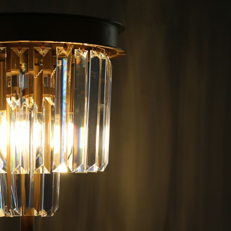 シャンデリアタイプのスタンドランプ。ガラスの反射が美しくとても雰囲気のある佇まいです。高さが比較的あるので低めのテーブルやサイドテーブルにも合うスタンドです。