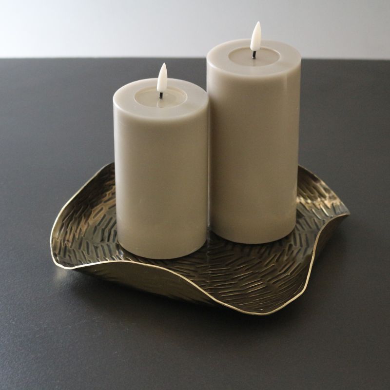 渋めのゴールドカラーのトレイです。リムの部分が立ち上がったデザインは、動きがあって上に乗せるものを際立たせます。キャンドルやデコレーションなど季節の飾りを置いたり、アクセサリートレイとしてもいいですね。マルチに使えるアクセントトレイです。