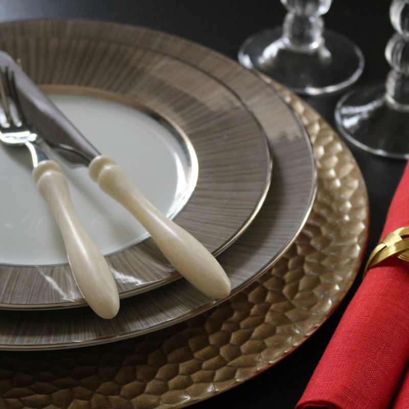 落ち着いたシャンパンゴールドカラーのアンダーディッシュ。これからの季節に華やかなテーブルセッティングにプラスになる1枚です。組み合わせる食器やテーブルリネンなどにより、印象も変わるのでコーディネイトが楽しくなります。