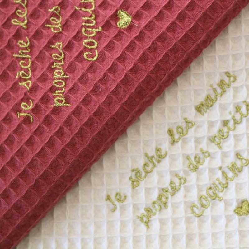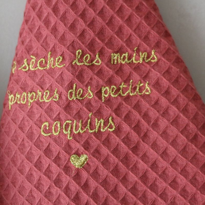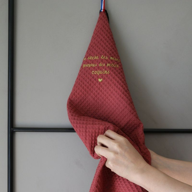 フランス語の刺繍「私は小さないたずらっ子たちの手を拭きます」がアクセントになったトーションです。