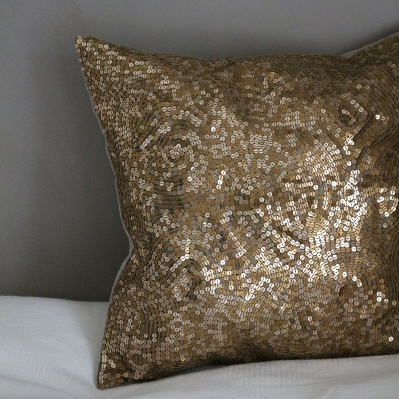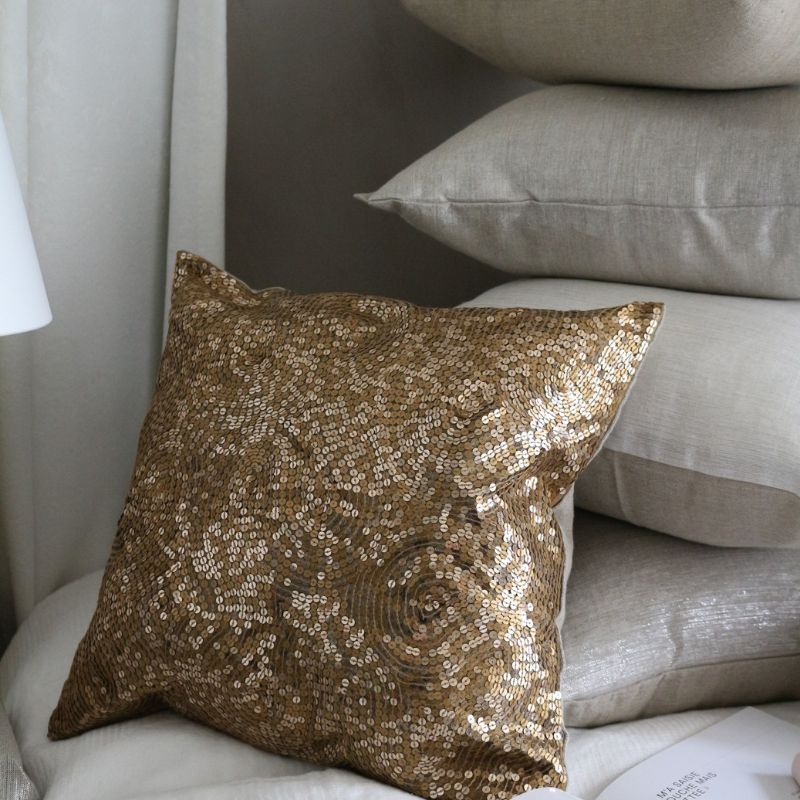 渦巻くような流れるデザインが印象的なTourbillonクッションカバー。ゴールドのスパンコールが一つひとつ丁寧に施され、まるで光が舞うようなエレガントな輝きを放ちます