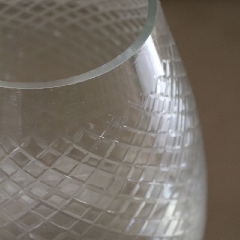 細やかな格子状のカットが全面に施されており、光を柔らかく反射しきらめくクリアガラスベースです。光の角度によって様々な表情を見せるカットガラスが、空間に洗練された輝きとモダンなリズムを加えます。