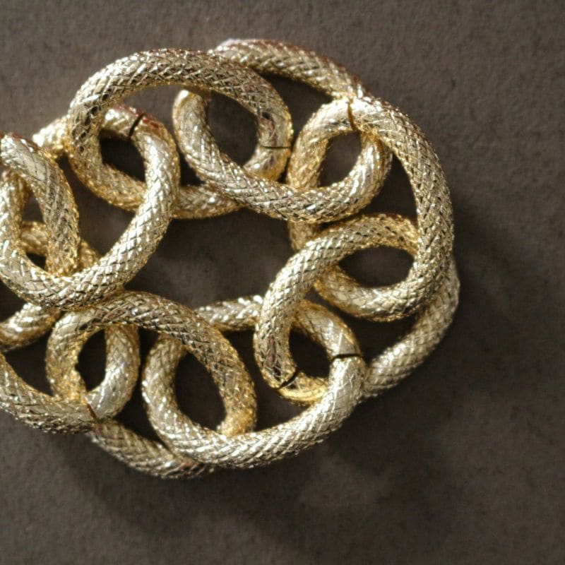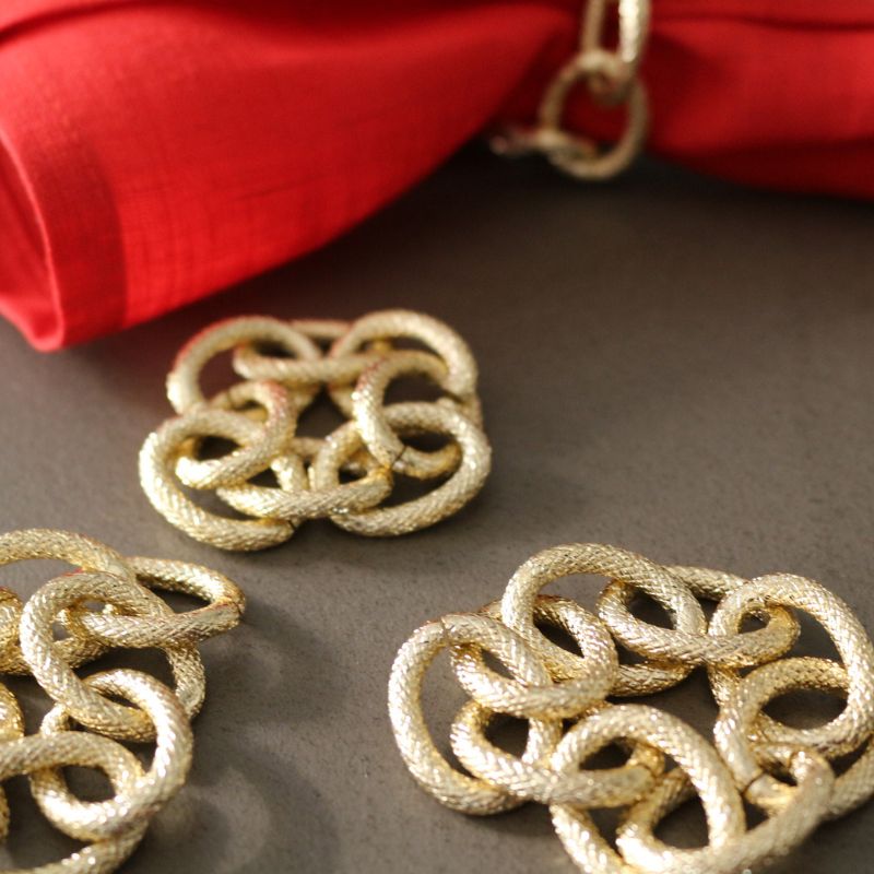 絡み合うようなチェーンモチーフが、ナプキンに力強いエレガントさをプラス。シンプルなリネンナプキンから柄物まで、モダンで都会的なムードを演出します。