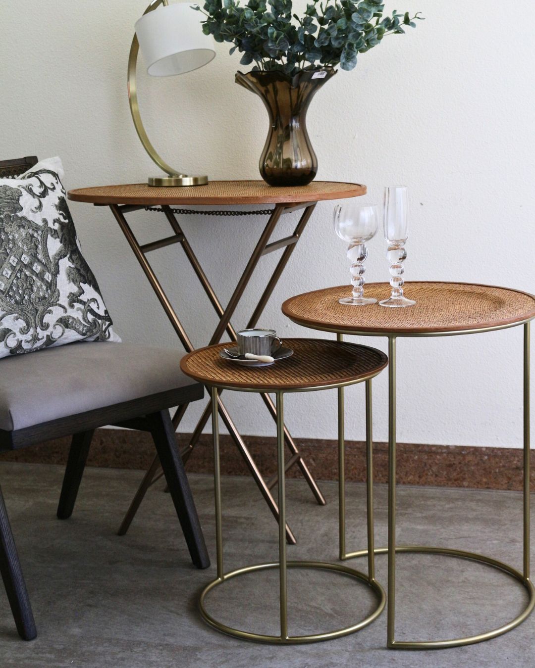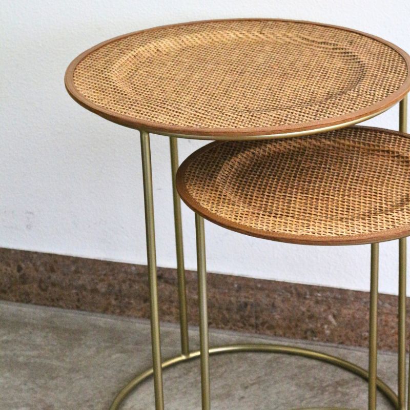 小φ40.5㎝ H50.5㎝素材 :脚ブラス 天板ラタン・レザー原産国:インド自由自在なレイアウト。ラタン天板のネストテーブル